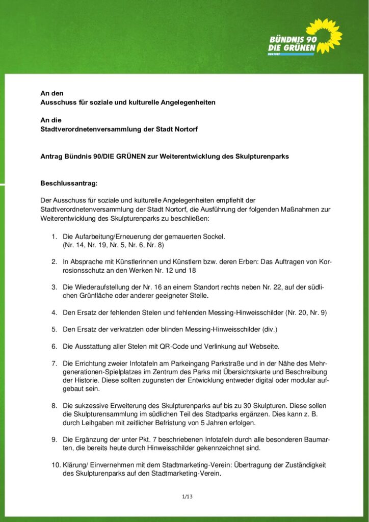 Zudem sollen die Entwicklungsmöglichkeiten ausgeschöpft werden, um den Skulpturenpark langfristig zu erweitern und seine Attraktivität zu steigern. Um dies zu Gewährleistung, soll die Zuständigkeit für den Skulpturenpark in aktive kompetente Hände gelegt werden.