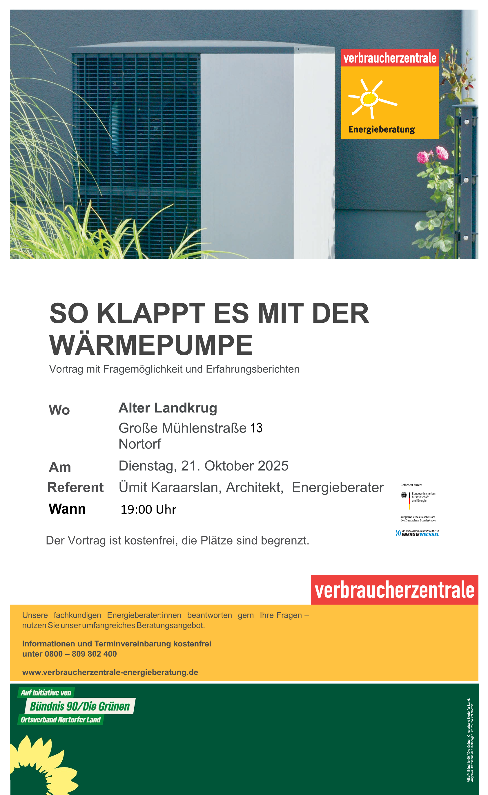 Unter dem Motto „Energieeffizient in die Zukunft“ lädt der Ortsverband Nortorf von Bündnis 90 / Die Grünen in Zusammenarbeit mit der Verbraucherzentrale alle Interessierten zu einer Informationsveranstaltung rund um das Thema Wärmepumpe ein. Die Veranstaltung findet am Dienstag, 21.10.2025 um 19:00 Uhr in Nortorf, Hotel „Alter Landkrug“, Große Mühlenstraße 13 statt.