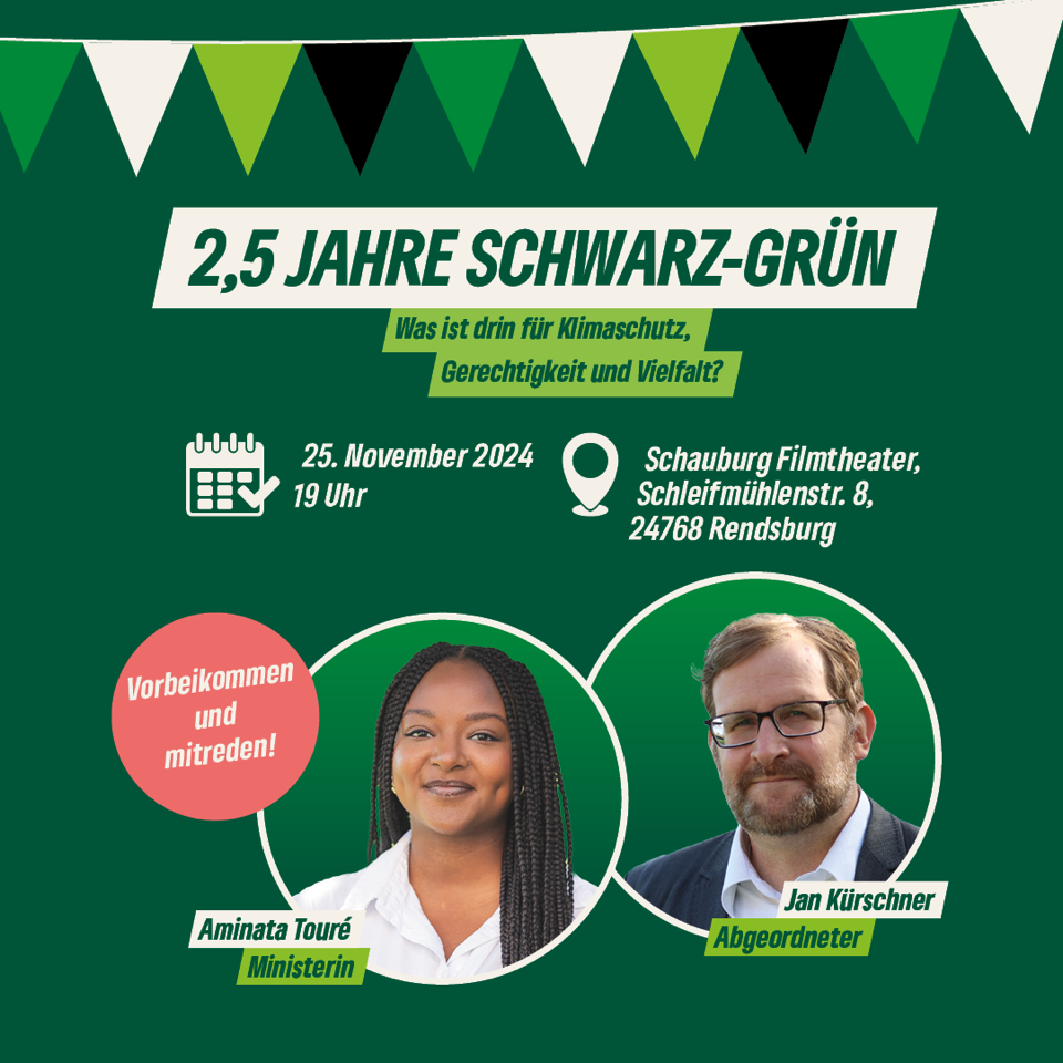 Diskussionsveranstaltung mit der stellvertretenden Ministerpräsidententin Aminata Touré und dem innen- und rechtspolitischen Sprecher der Grünen im Landtag Jan Kürschner. Die Ministerin und der Landtagsabgeordnete blicken auf 2,5 Jahre Schwarz/Grün zurück, geben Ausblick auf die 2. Halbzeit und freuen Sie auf einen regen Austausch mit Ihnen/euch.